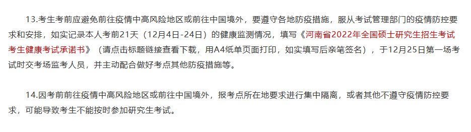 对考研人的要求河南省省招办发布的公告中明确规定,参加2022年全国硕士研究生招生考试的考生,考前应避免前往疫情中高风险地区或前往中国境外,服从考试管理部门的疫情防控要求和安排,如实记录本人考前21天(12月4日-24日)的健康监测情况,填写《河南省2022年全国硕士研究生招生考试考生健康考试承诺书》,于12月25日第一场考试时交考场监考人员。