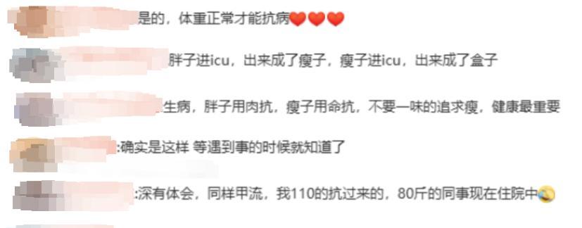 另一位网友也提到,以前她总是羡慕那些苗条的女孩,但后来发现,体重过轻反而容易生病,抵抗力也不好。