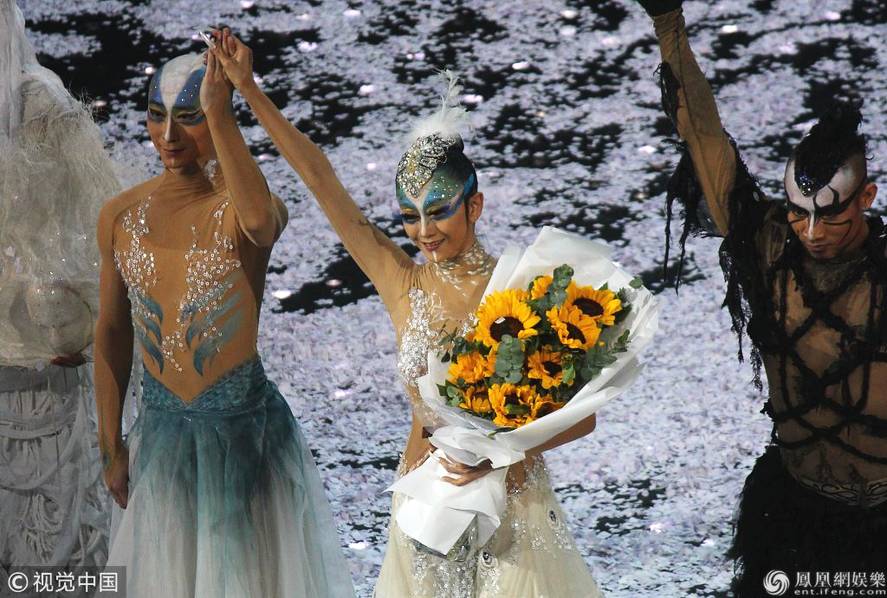观众送上鲜花并报以热烈掌声久久不愿离去,杨丽萍十分激动,感动得热泪盈眶。