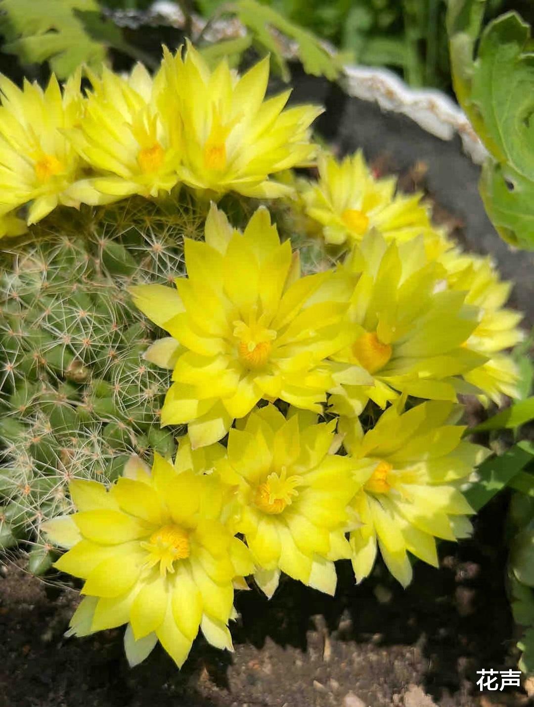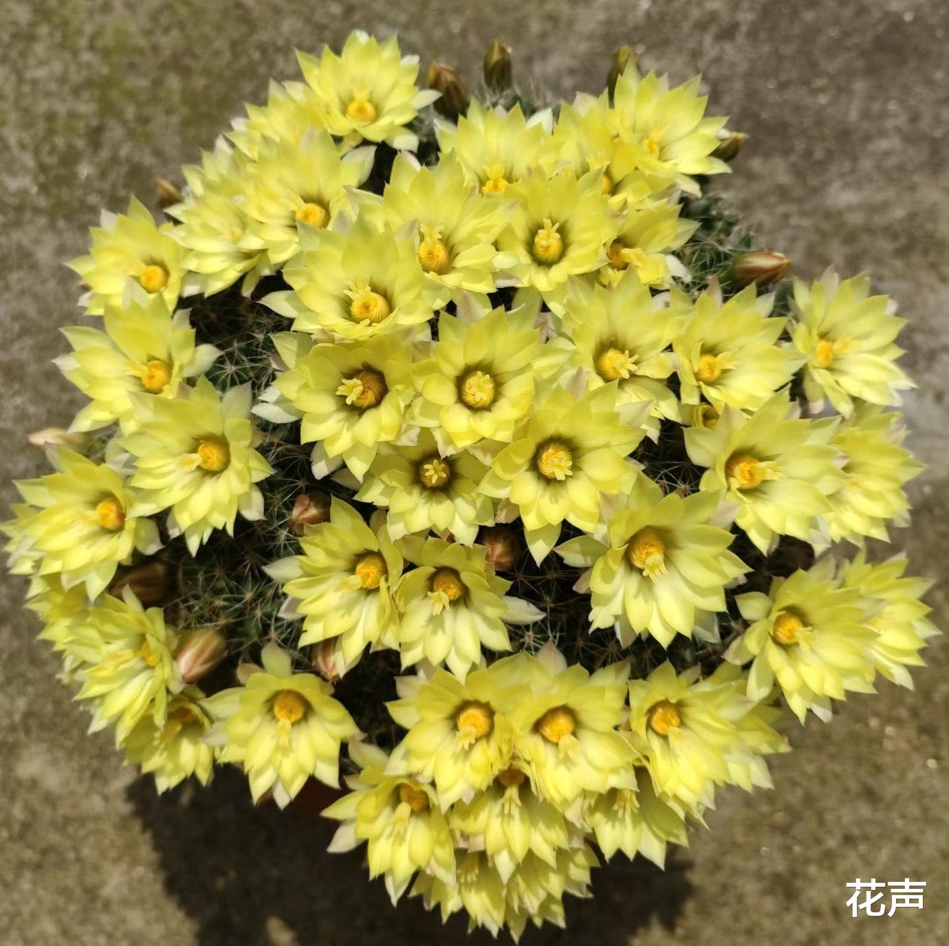 不过它的花朵也很具有观赏性,花生于疣突的叶腋间,绽放于球身顶端,花直径5-6厘米,漏斗状,花瓣有两三层,呈莲座分布,整整齐齐,黄色,在阳光底下金灿灿、闪亮亮,像抹了层荧光粉,仿佛会发光一样,亮晶晶的。