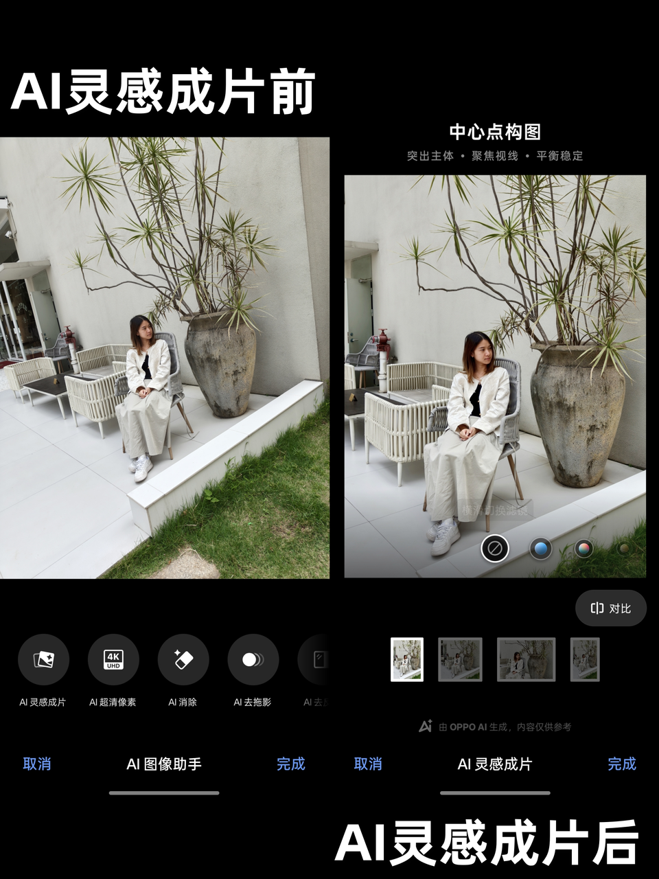 值得一提的是,这次Find X8 Ultra还新增了一个「AI灵感成片」功能,即便你不懂得如何拍摄构图,系统也能根据拍摄角度智能修正畸变,恢复人物自然比例,甚至还会推荐合适的滤镜风格,实现“废片”变“大片”的效果。再搭配上原本备受好评的AI路人消除、AI去反光、AI去拖影等功能,就算是小白用户也能实现随手拍大片的体验了。