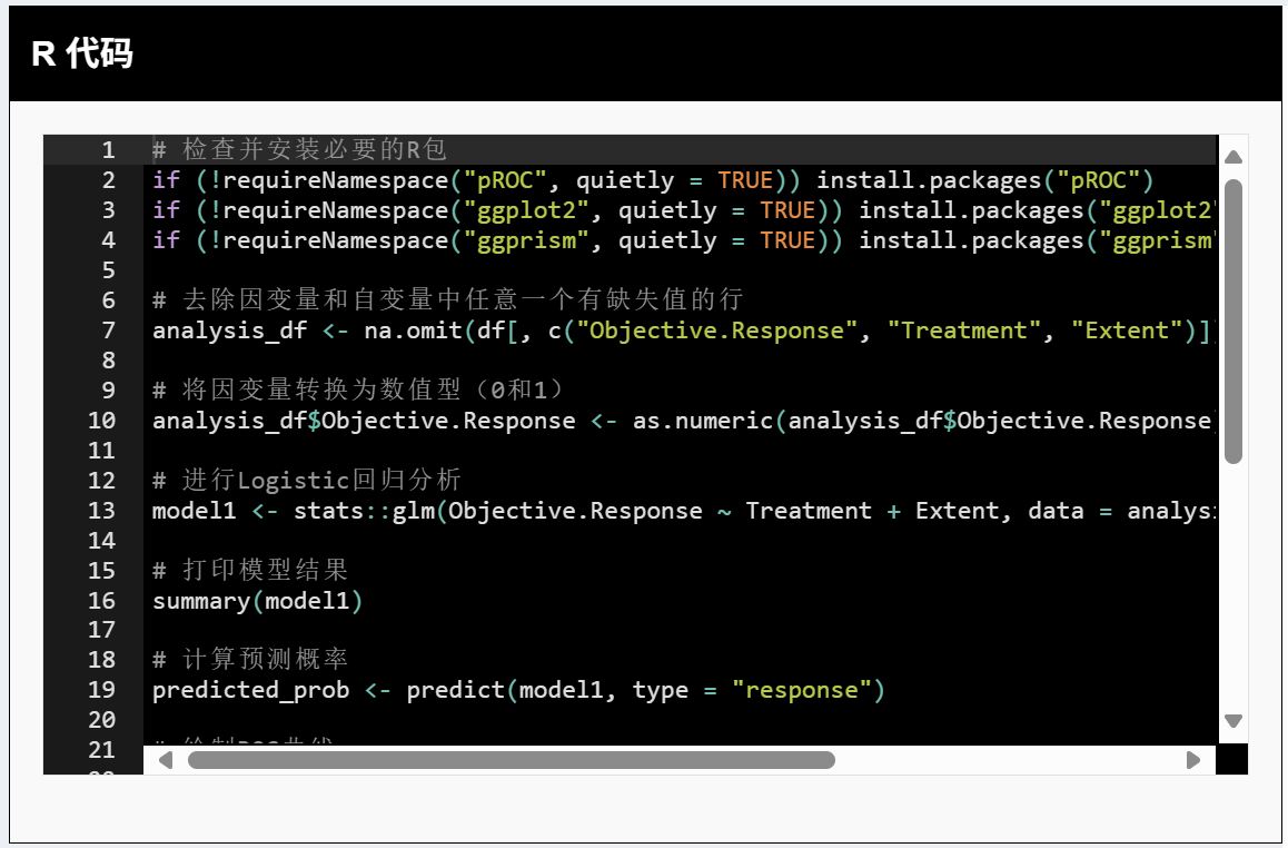 以'Objective.Response'为因变量(二分类),'Treatment','Extent'作为自变量做 Logistic 回归;并做模型的ROC曲线,并添加AUC值。做上述分析时先将应变量和自变量任意一个有缺失值的行去掉。