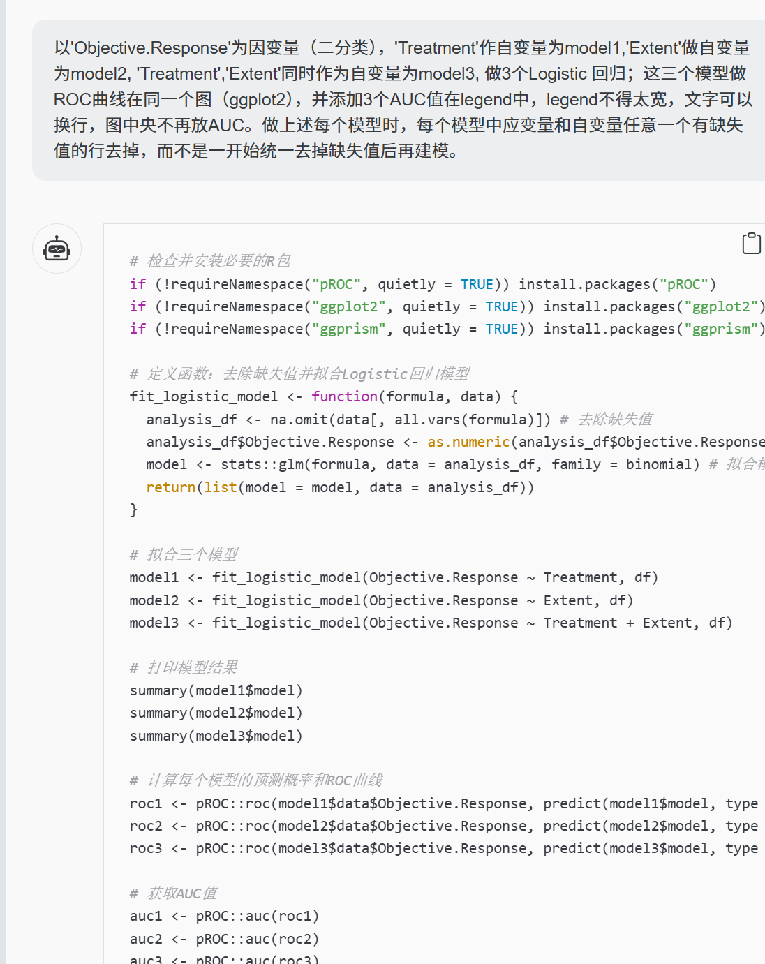 以'Objective.Response'为因变量(二分类),'Treatment'作自变量为model1,'Extent'做自变量为model2, 'Treatment','Extent'同时作为自变量为model3, 做3个Logistic 回归;这三个模型做ROC曲线在同一个图(ggplot2),并添加3个AUC值在legend中,legend不得太宽,文字可以换行,图中央不再放AUC。做上述每个模型时,每个模型中应变量和自变量任意一个有缺失值的行去掉,而不是一开始统一去掉缺失值后再建模。