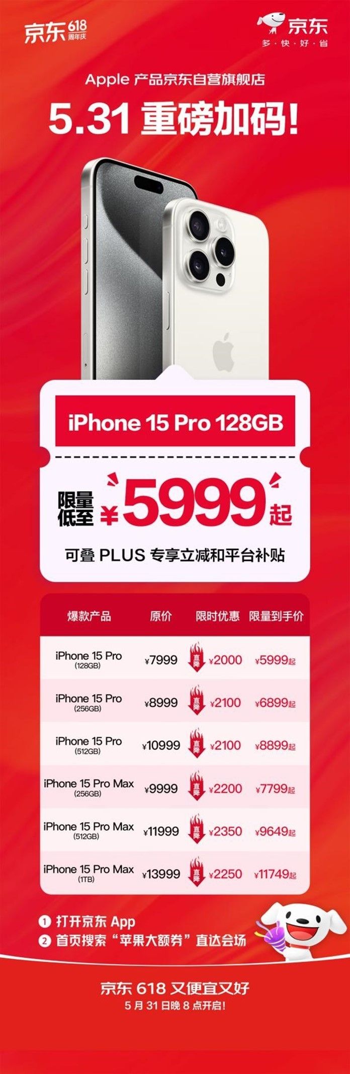 【CNMO科技消息】5月31日晚8点,京东618正式开启,Apple产品京东自营旗舰店已率先加磅!iPhone 15 Pro系列低至5999元,PLUS会员专享立减32.74元起,晚8点还能叠加20元平台补贴。买Apple产品首选京东618,打开京东APP搜索“苹果大额券”就能找到。