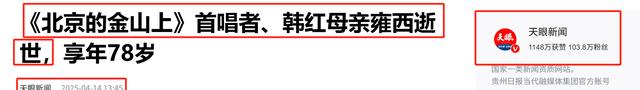 天眼新闻,2025-04-14,《北京的金山上》首唱者、韩红母亲雍西逝世,享年78岁