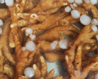 浸泡糖液的鸡爪进行油炸处理,油炸温度控制在180℃,油炸时间5-8min。