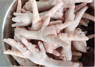 将解冻的鸡爪去除边缘的角质层,修剪指甲,修整成形,肉温≤8℃。