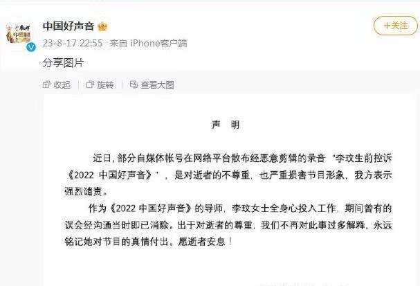 8月17日,有博主爆料李玟生前录制好声音时与节目组发声争执的8分钟录音,除了谴责节目组暗箱操作,对选手不公平之外,李玟还愤怒地指责节目组“一群坏人”。