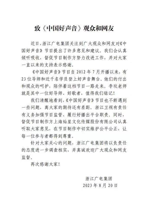 8月20日晚,浙江广电发文回应观众对《中国好声音》栏目的质疑。称将对节目组进行调查,维护公平公正。还不忘夸赞COCO两句,称李玟是一位好导师,好歌者,值得铭记。