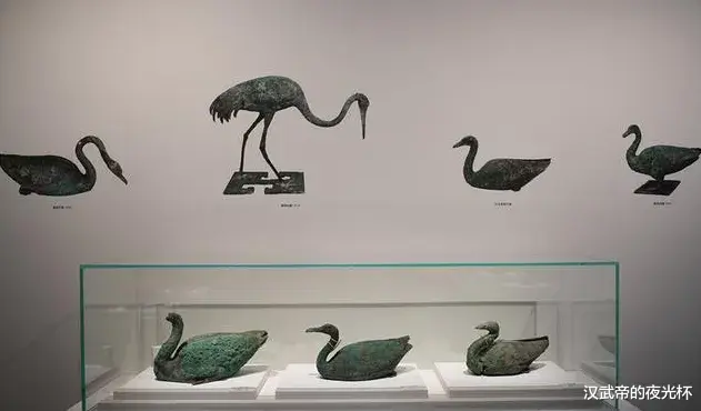 令人惊叹的是,每一件青铜水禽都捕捉并展示了水禽动态过程中的精彩瞬间。天鹅的姿态各异,有的亭亭玉立,有的悠然侧卧,仿佛正沉浸于觅食或休息之中。部分鹤的口中还含着铜质虫状物,生动地再现了它们从水中捕捉食物后,尖喙刚刚离开水面的那一刹那的生动场景。而鸿雁则以其特有的曲颈鸣叫之姿,为整个场景增添了几分生动与和谐。