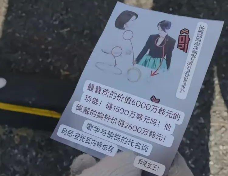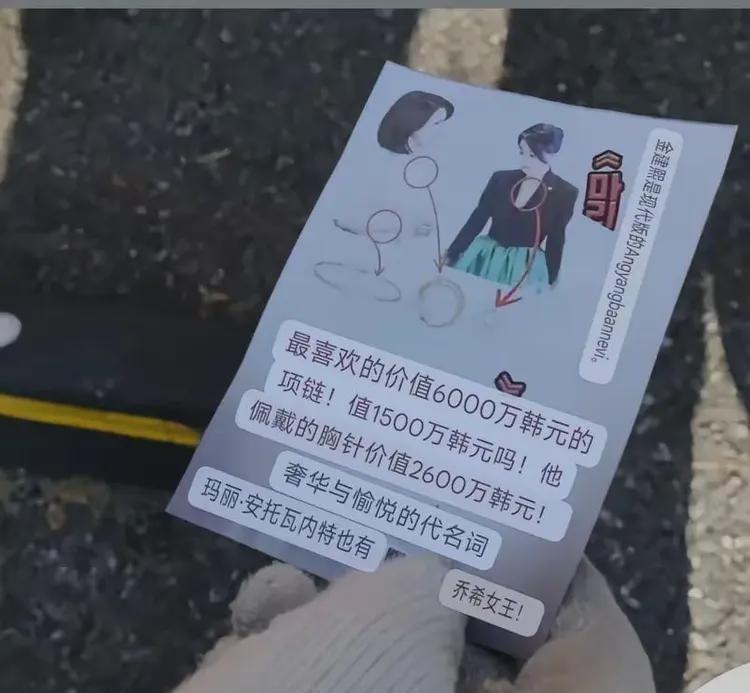 他们传单上出现了韩国第一夫人金建希,曝光了她的衣服的品牌以及价格,而且还曝光了她的首饰全都是顶级奢侈品,比如项链6000万,胸针2600万,全部标明价格,清清楚楚。