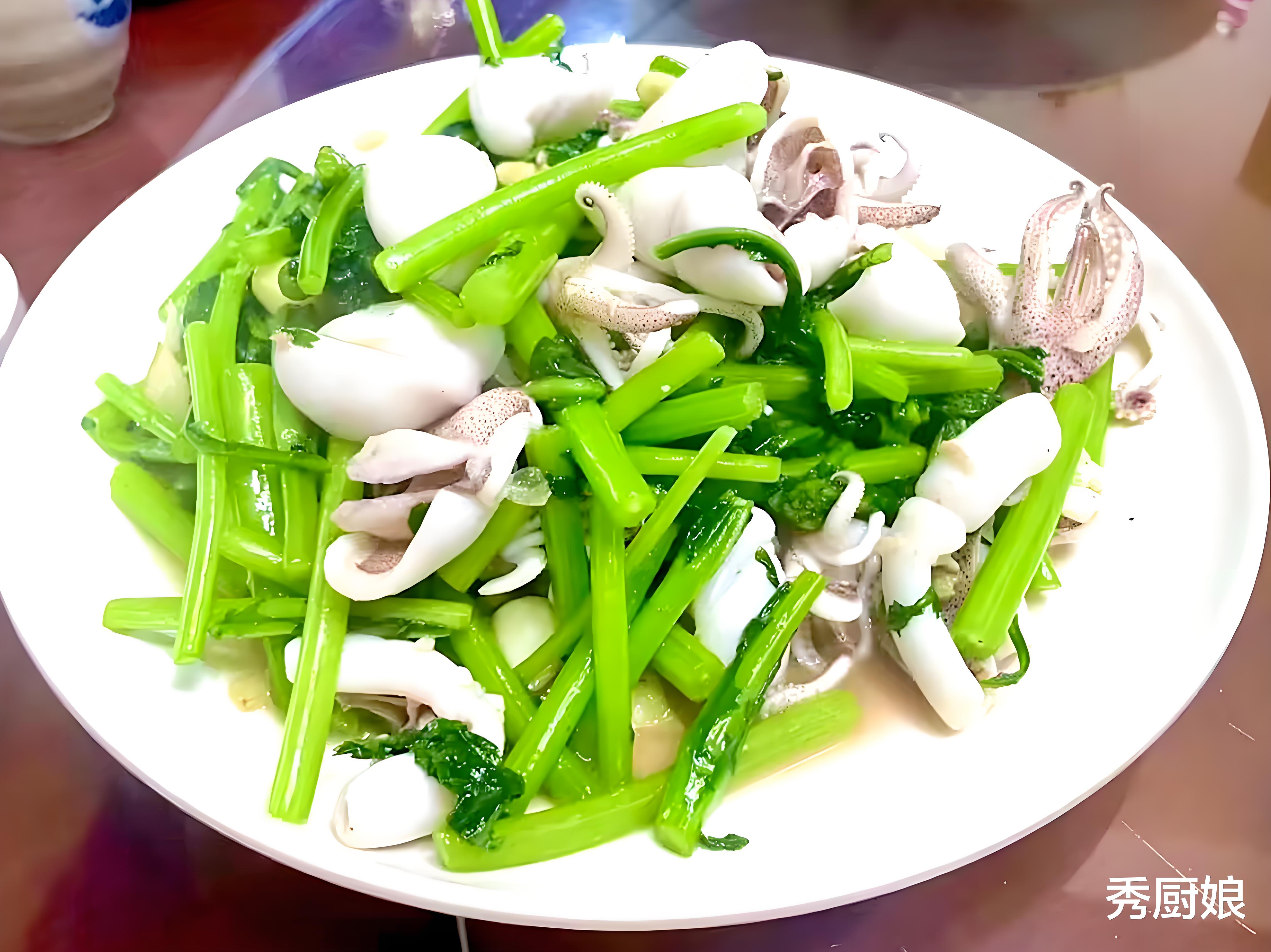 点评:海兔焯水时加点料酒去腥,全程大火快炒才能保持茼蒿翠绿。这道菜自带海鲜咸鲜,连味精都不用放!