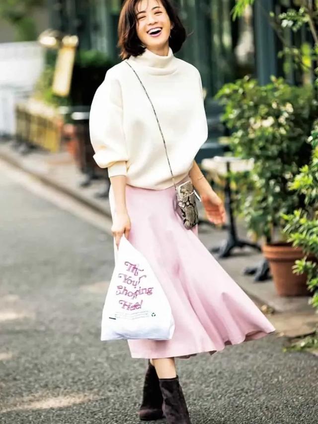 针织衫的弹性面料可以适度修饰肩颈与上半身线条,不挑肩型、不显臃肿;而半裙在遮胯、遮腿、调整比例方面也有天然优势,尤其适合微胖、梨型或大腿粗的姐妹。
