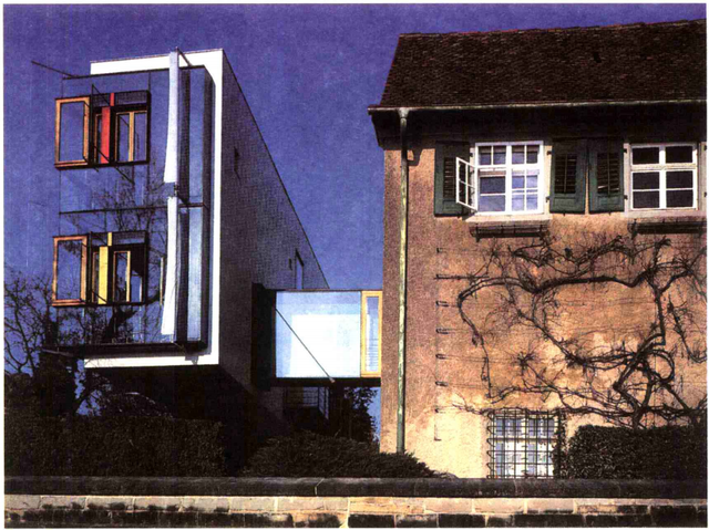 “增建住宅”是一座有300年历史的古宅的增建部分。这座古宅紧临康士坦茨湖,房主人对其怀有深厚的感情,要求设计者不能破坏古宅的原貌。克力斯多夫·马克勒将增建部分设计成一个3.65米×18.29米的薄片,使面对湖水的古宅成为主要立面,两者之间以一座玻璃桥连接,从而给自己自由设计保留了余地。新建筑一部分用混凝土柱支撑,一部分用钢珠站立在一半沉陷入地下的起居室上方。起居室除了用侧窗采光外,屋顶上还有像昆虫眼睛样的天窗。“薄片”两端为卧室,为了最大限度地欣赏湖上美景,卧室面对湖水的侧墙完全采用玻璃幕墙,在玻璃上安装有鲜艳的木框窗户——具有荷兰“风格派”的特点。克力斯多夫·马克勒是德国新一代著名的建筑师和理论家,他对现代主义的结构形式重新进行了考虑,并且著书立说。