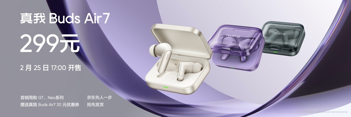 真我Buds Air7 起售价299元,参与京东先人一步更可享抢先发货。首销周购买GT、Neo系列产品,还可获赠30元真我 Buds Air7优惠券,到手价低至269元。