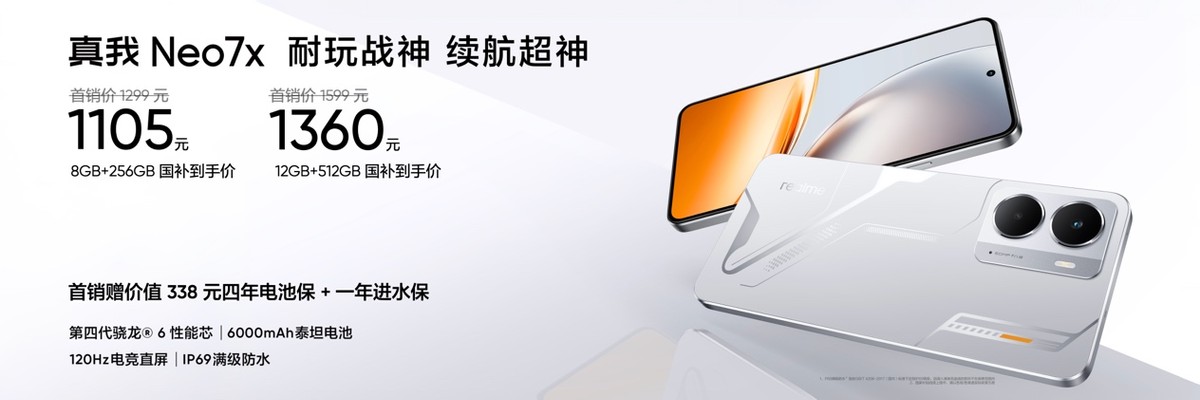 Neo系列千元战略新品——真我Neo7x。首发第四代骁龙6,同时配备6000mAh泰坦电池和IP69满级防水。真我Neo7x将于2月25日17:00全渠道开启预售,首销价1299元起,国补到手价仅1105元起;