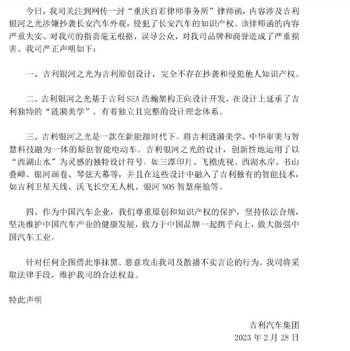 昨日,长安汽车长安汽车给吉利汽车送去一份律师函,原因是前不久吉利发布的“银河之光”原型车,涉嫌抄袭长安的设计。