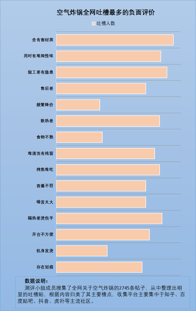 用空气炸锅做饭对人体有伤害吗?使用不专业的空气炸锅的话,的确容易给人体健康安全造成负面影响,这对任何一个普通用户来说,都可能造成意外之灾。尤其需要注意的是,这类产品往往存在多致害因素,关于这点,从下面这张空气炸锅负面评价的统计图上,我们可以很直观地看到。所以不专业空气炸锅是真正的祸根,而这类产品为什么会形成如今泛滥成灾的局面呢?这就要提到我们接下来要说的行业四大套路了。