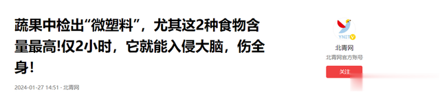 信息来源:北青网 《蔬果中检出“微塑料”,尤其这2种食物含量最高!仅2小时,它就能入侵大脑,伤全身!》2024-01-27
