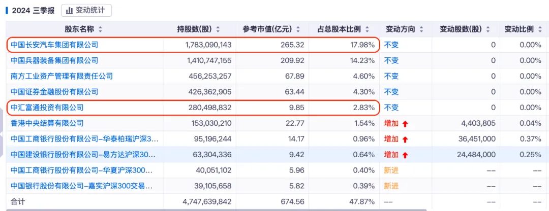 中国长安是长安汽车的控股股东,直接持有长安汽车17.98%的股份,并通过子公司中汇富通投资有限公司间接持有长安汽车2.83%的股份,合计持有20.81%。此外,兵器装备集团及其一致行动人控制公司39.68%的股份。