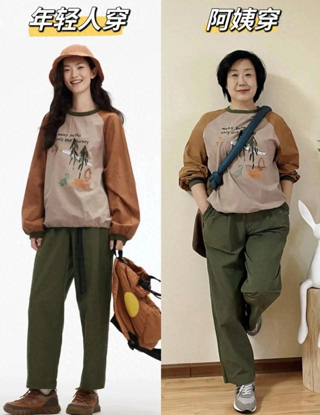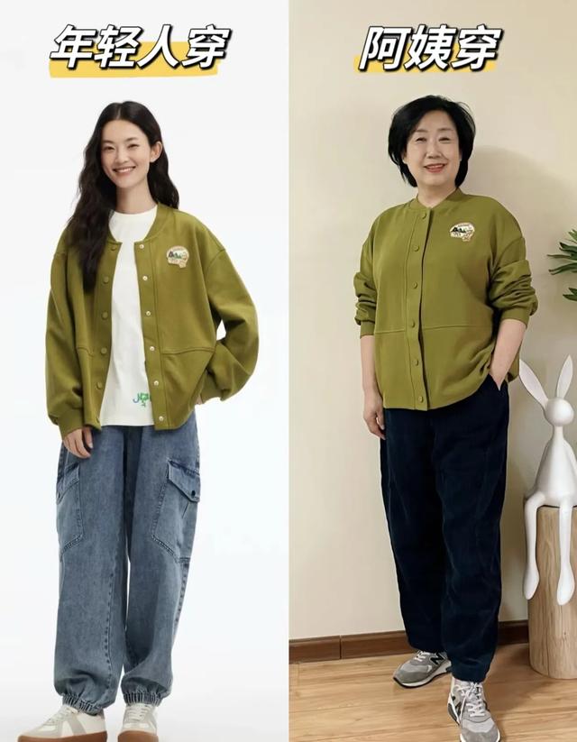 不过学习穿搭也不能全部照搬,还是要根据自己的风格和身材来选择适合自己的打扮,比如这件绿色的外套,年轻人搭配的是蓝色牛仔裤,阿姨大胆的舍弃牛仔裤,换成黑色束脚裤,看起来比年轻人还时尚。