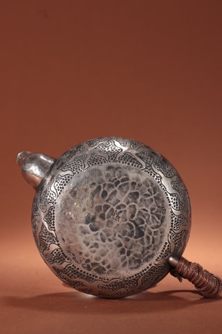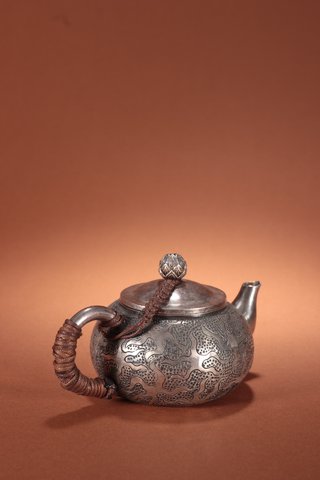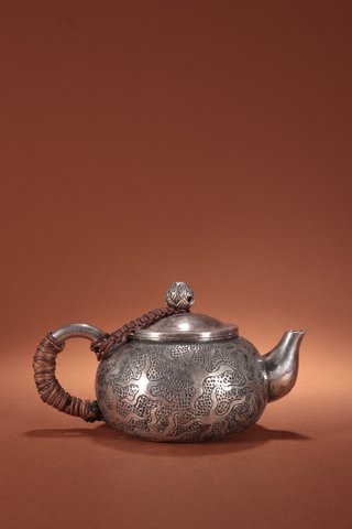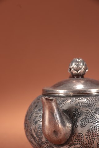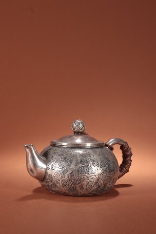 民国-纯银铸造茶壶 规格:高7.7cm口径4.6cm重239g 此件藏品取纯银胎,提梁造型雅致饱满,氧化自然,纯手工捶打、工艺精湛,线条流畅,刀工一流,包浆厚重古朴,收藏极佳品。