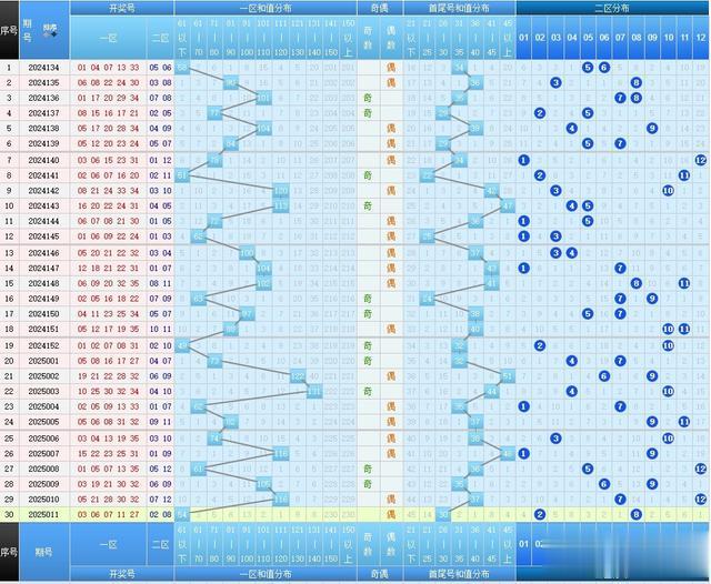 后区号码分析:在历史同期数据中,后区的和值与跨度均呈现出平衡的状态。本期留意两码08和11,它们在后区的出现频率较高,值得关注。