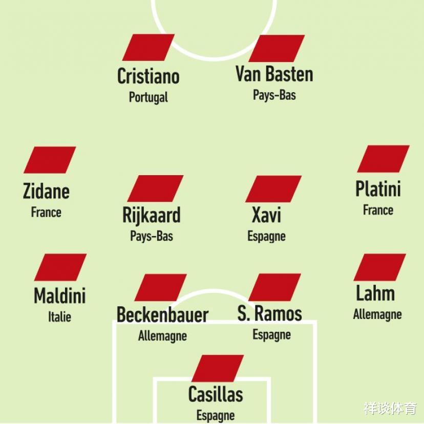 说完了后防线再来看中场,中场方面队报给出了一个四中场组合。法国队占据两个席位,齐达内以及普拉蒂尼分别入选。齐达内作为一代中场大师,他个人也曾经和球队一起拿过欧洲杯,在这项杯赛当中留下过非常多的经典时刻。至于他的同胞普拉蒂尼,更是有过在单届杯赛当中5场9球率队夺冠的奇迹。时至今日,仍然有不少球迷认为普拉蒂尼才是欧洲杯这项赛事上有史以来表现最好的球员。