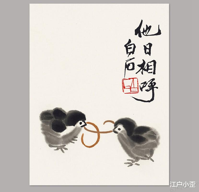 原来,白石老人很清楚鸡有五德这个概念,但他平时是以造化为师,在实际生活观察中,他发现小鸡还是自私抢吃的,而老鸡见到食物呼唤同伴。