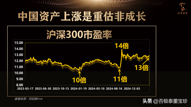 924 以来,沪深 300 已上涨 30% 左右。然而,当前沪深 300 的市盈率仍仅 13 倍。对比之下,日本经济 完全没有前途,只是随波逐流的国家。但即便如此,日经 225 指数的市盈率仍比沪深 300 高 50%!这说明,在过去半年内,中国资产的强劲上涨,根本原因并不是成长,而是被低估后的重估。