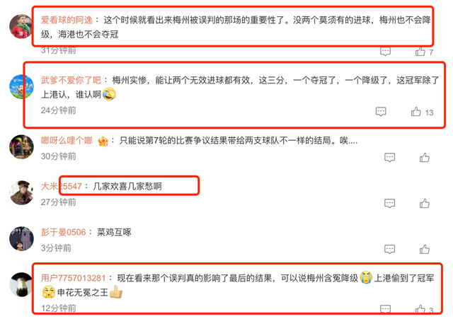 就在海港夺冠之后的各大媒体评论区里,多位网友点评海港这冠军就是偷来的,还同情起梅州客家,直言梅州客家实惨、太憋屈:“偷来的冠军,怎么庆祝都不过分”“千古奇冤梅州”“没两个莫须有的进球,梅州也不会降级,海港也不会夺冠”“一个夺冠了,一个降级了,这冠军除了上港认,谁认啊”