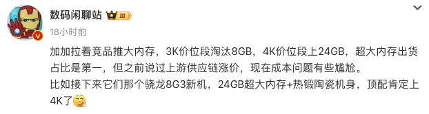 不过还没完,这次一加官方说冰川电池是专为Ace Performance高性能手机打造,意味着一加Ace3 Pro性能也超强,按照站哥的说法来看,这次一加Ace3 Pro会有一个芯片黑科技,能榨干骁龙8 Gen3处理器。同时站哥还暗示一加Ace3 Pro这次可能会上24GB大运存,这配置属实有点不讲武德了,现在内存涨价价格应该不便宜,起步应该要3K,顶配或者要上4K,不过配置这么顶感觉还是很香的,大家认为呢?
