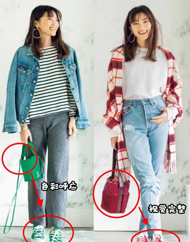 若是充满色彩感的彩色穿搭,那可以利用帆布鞋和上衣或帽子、包包形成色彩呼应,相似或相同颜色的相互照应,独具亮点。