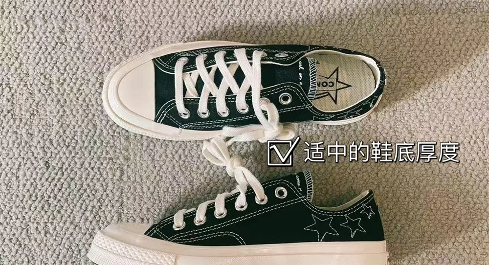 这里咱们建议大家根据自身的身高去选择鞋底的厚度,像身材玲珑小巧的女生,个子在165cm以下,可以穿2-3.5cm厚度的帆布鞋。身高在165cm以上,高个子的女生适合穿1-2cm鞋底厚度的帆布鞋,驾驭起来更加轻松。