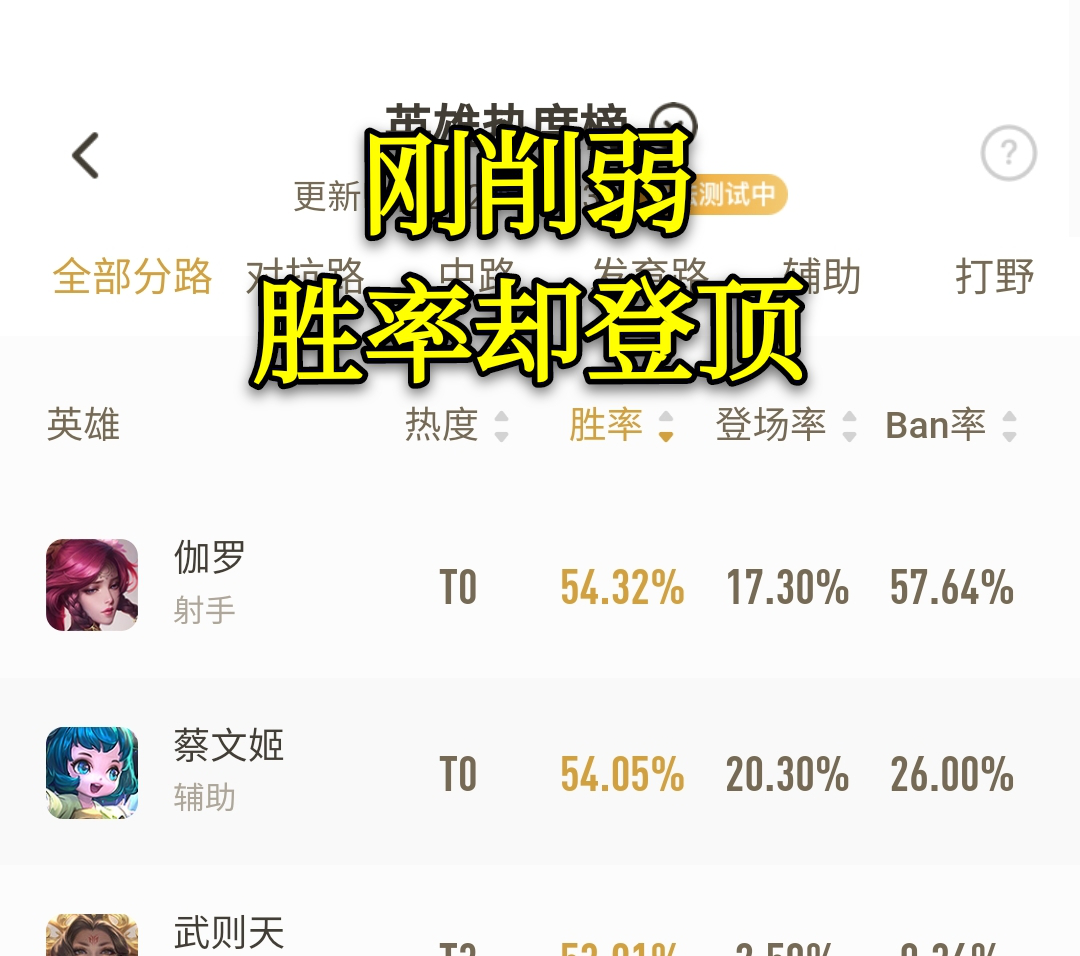 很快便有一些小伙伴惊讶地发现,伽罗确确实实削弱过了,但她的胜率不跌反增,现在甚至已经爬到了全英雄第一了。这可真的是一件怪事。毕竟以前只听说过挨刀掉胜率的,没听说过挨刀还会加胜率的。相比较加强后的白起和刘备就惨多了,他们在这个版本被半重做,本来是为了加强才去重做的,没想到胜率却比之前惨淡了不少。