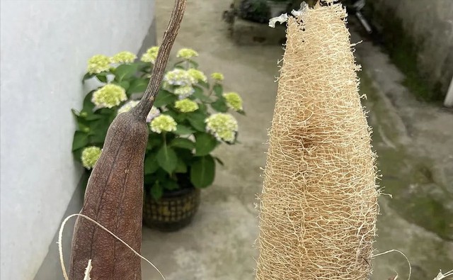 这时候丝瓜的表皮已经风化了,轻轻一碰就与内里的丝络分离开,这就形成了丝瓜络。
