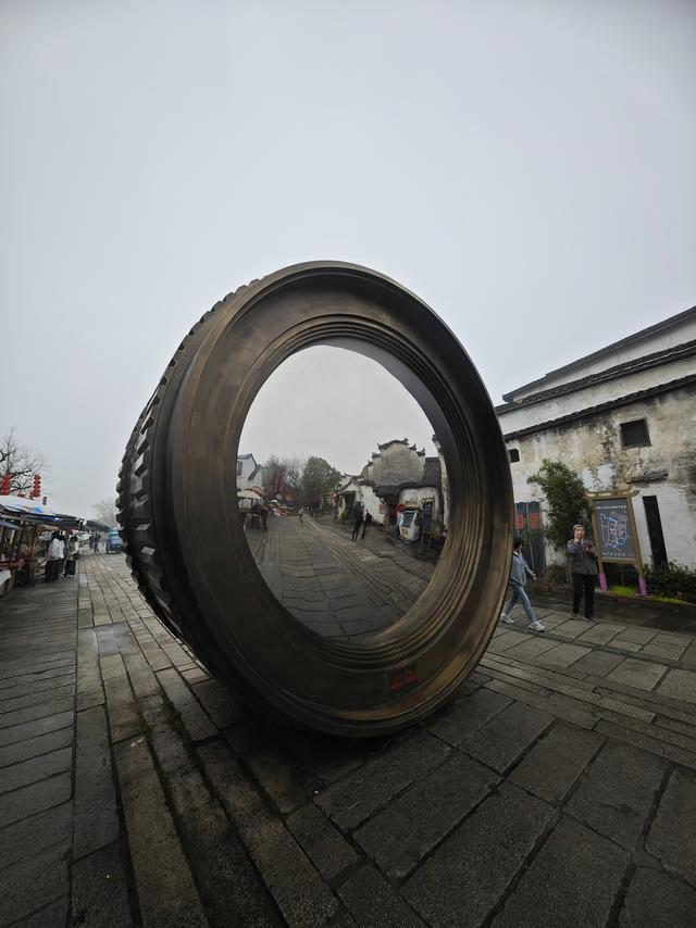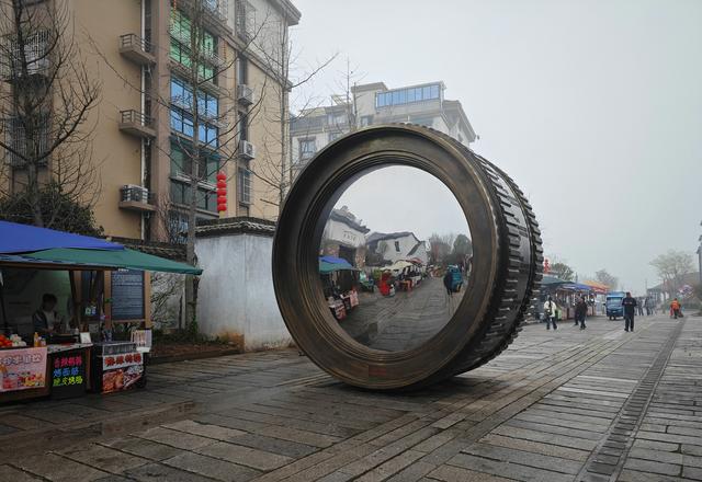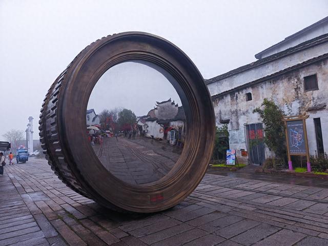 这个打了引号的,硕大的仿制“镜头”在湖州市游埠古镇的入口处。它矗立于街道的正中间,大约有“一层楼”那么高。现场看到,从“镜头”的正面,可以反射出对面的徽派建筑和街道,仿佛在取景构图,这个设计还是颇有点创意的。图一。