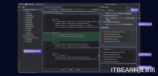 据介绍,通义灵码AI程序员率先在国内引入了多文件代码修改能力。例如,AI 程序员会对工程内多个代码文件同时进行修改,开发者可以清楚地看到多个文件的生成过程及状态,并与原文件进行对比,开发者可以选择一键采纳或局部修改当前文件;当AI生成内容不符合预期或有需求变化时,可以通过快照功能回退并重新提问。