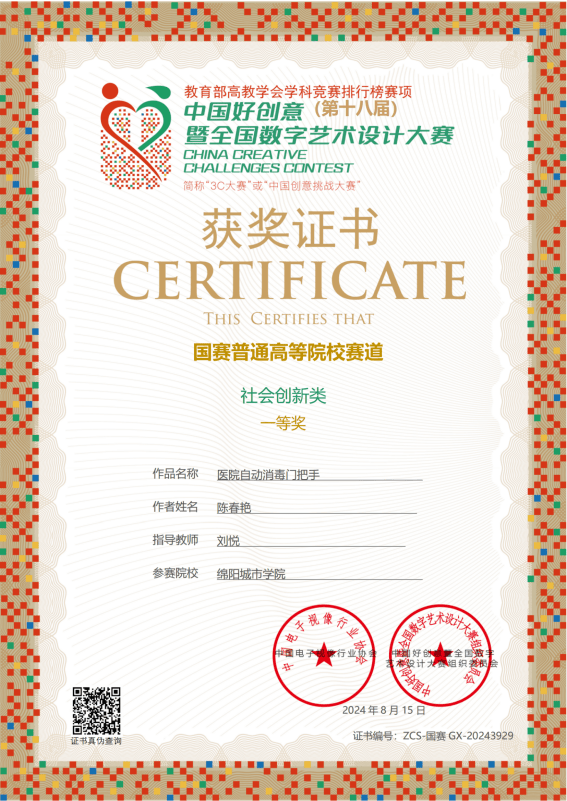 陈春艳同学在中国好创意暨全国数字艺术设计大赛结束后分享道,她的创意火花最初萌发自工作室某位老师的启发性指点。项目启动初期,她广泛涉猎了国内外消毒门把手设计的现有研究成果,细致剖析这些设计的外观美学与消毒功能原理,这一深入调研阶段因参考案例稀缺而显得尤为漫长。期间,在听取指导教师宝贵意见后经过反复的精雕细琢与机制改良,她为医院设计的消毒门把手因集实用性与创新性于一体获得大奖。获奖对她而言不啻为一份意外的喜悦,既是对她辛勤付出的回馈,也使她意识到在未来的道路上,深化专业知识的学习、持续累积实践经验将是实现个人成长与突破的关键。