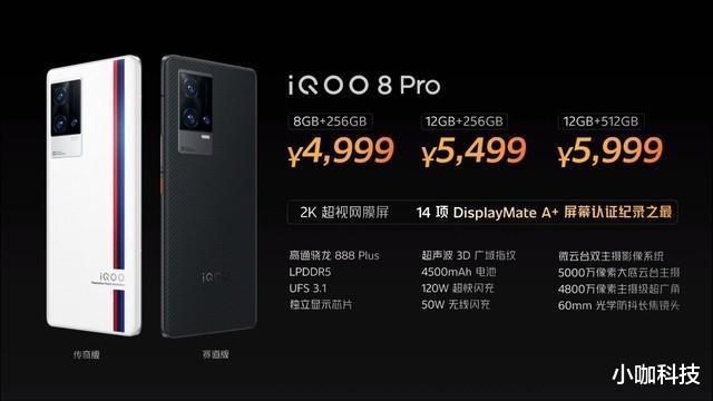 昨晚发的IQOO8系列除了无太大亮点外,更是营销无下限。从官方发布的消息来看,iQOO8搭载骁龙888处理器+独立显卡、6.56英寸AMOLED柔性直屏、分辨率为2376*1080、京东方独供、光电屏幕指纹,拥有4800万像素微云台主摄+1300万像素超广角+1300万像素专业人像镜头,120W有线充电、电池容量4350mAh……售价3799元起。而iQOO8Pro搭载骁龙888Plus处理器+独立显卡,6.78英寸2K E5 LTPO柔性曲面屏、屏幕同时支持2K+120Hz、三星屏幕、超声波3D广域指纹,5000万像素大底微云台主摄+4800万像素主摄级超广角+1600万像素OIS长焦人像镜头,120W有线充电、50W无线闪充、电池容量4500mAh,售价4999起,12GB+512GB版本售价高达5999。