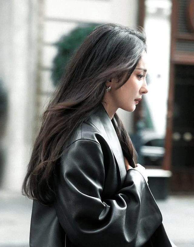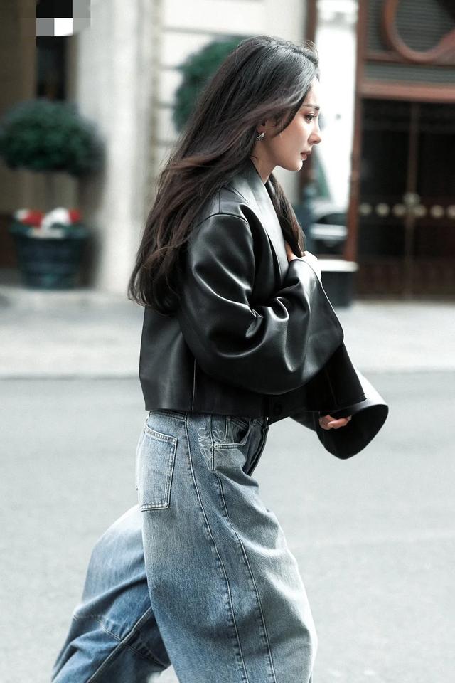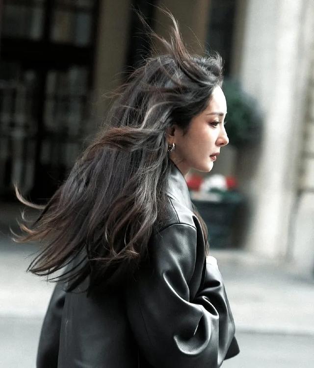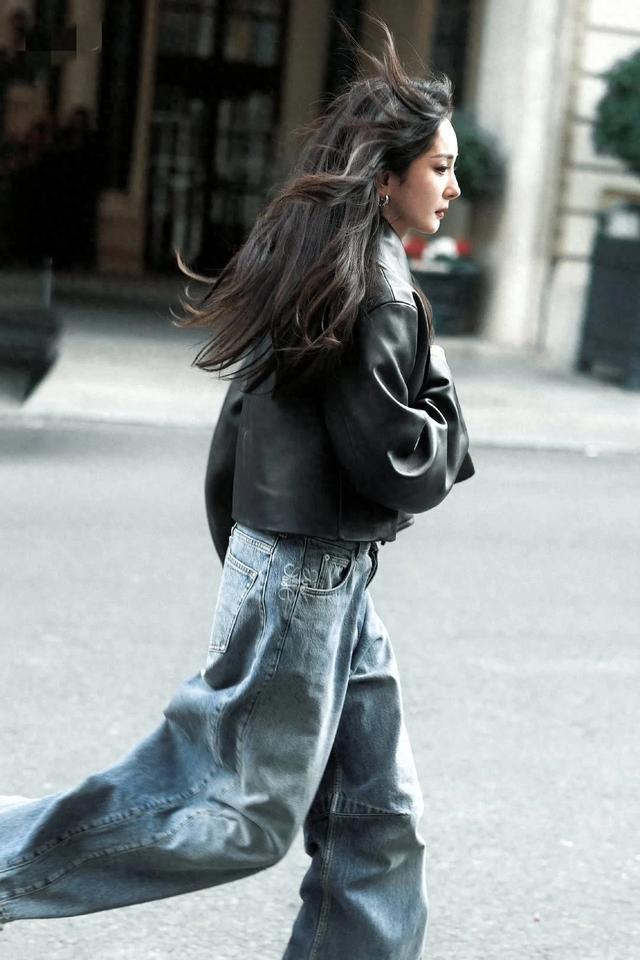 杨幂在大风里奔跑,身穿黑色皮夹克加牛仔阔腿裤,时尚活力满分
