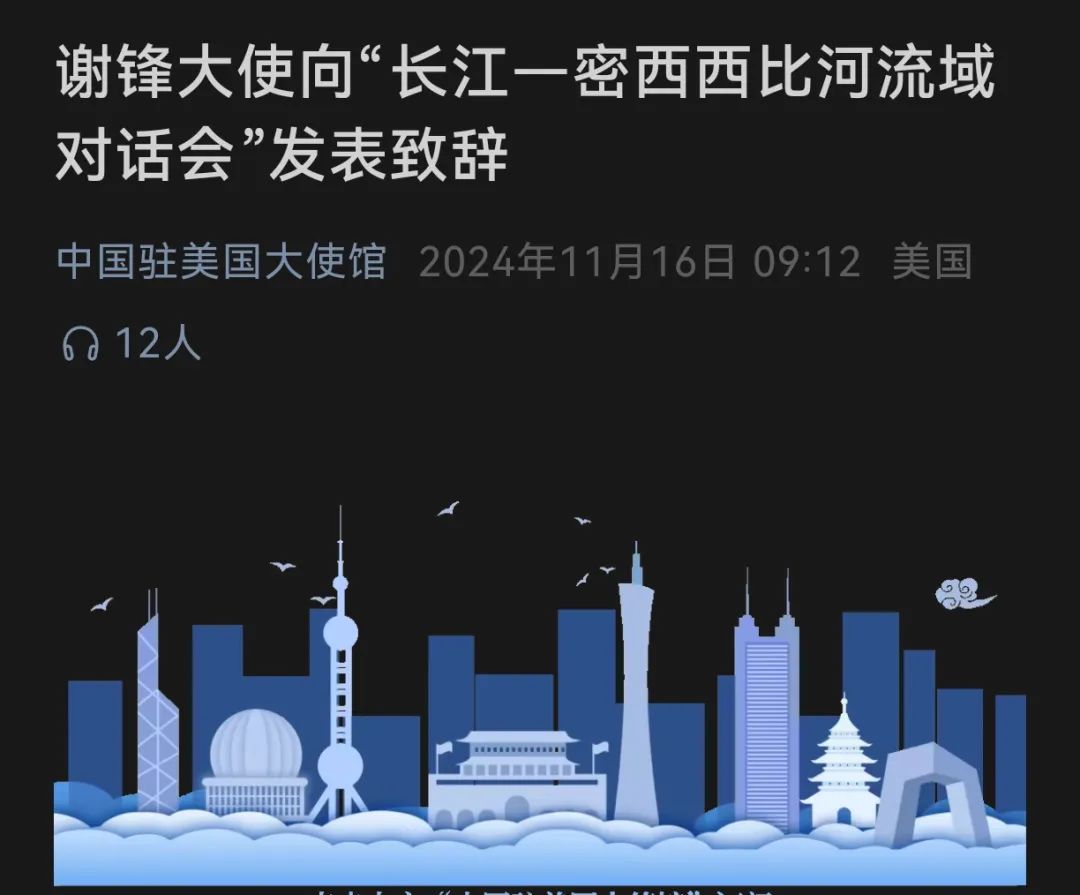 2024年11月15日,中国驻美国大使谢锋向“长江—密西西比河流域对话会”发表书面致辞,祝贺对话会成功举办。