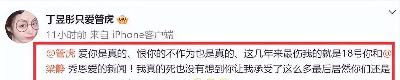 万念俱灰之际,她还喊话管虎: “爱你是真的,恨你不作为也是真的,这几年最伤我的就是18号你和梁静秀恩爱的新闻,我真的死也没想到你让我承受了这么多,最后居然你们还是恩爱夫妻,你还想让我怎么相信你?” 。