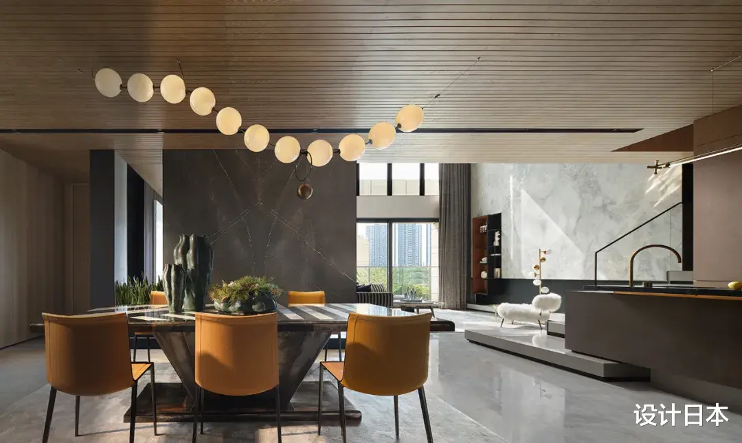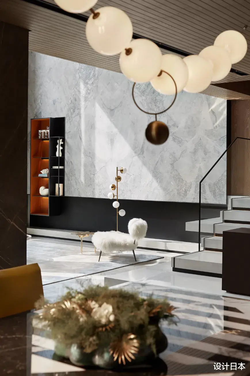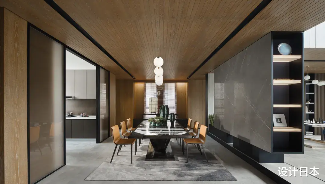 A semi partitioned wall made of marble not only looks beautiful and elegant, but also adds practical storage functions. The wooden materials used on the ceiling continuously inject warmth and comfort into the entire space, making everything below appear more intimate and pleasant.