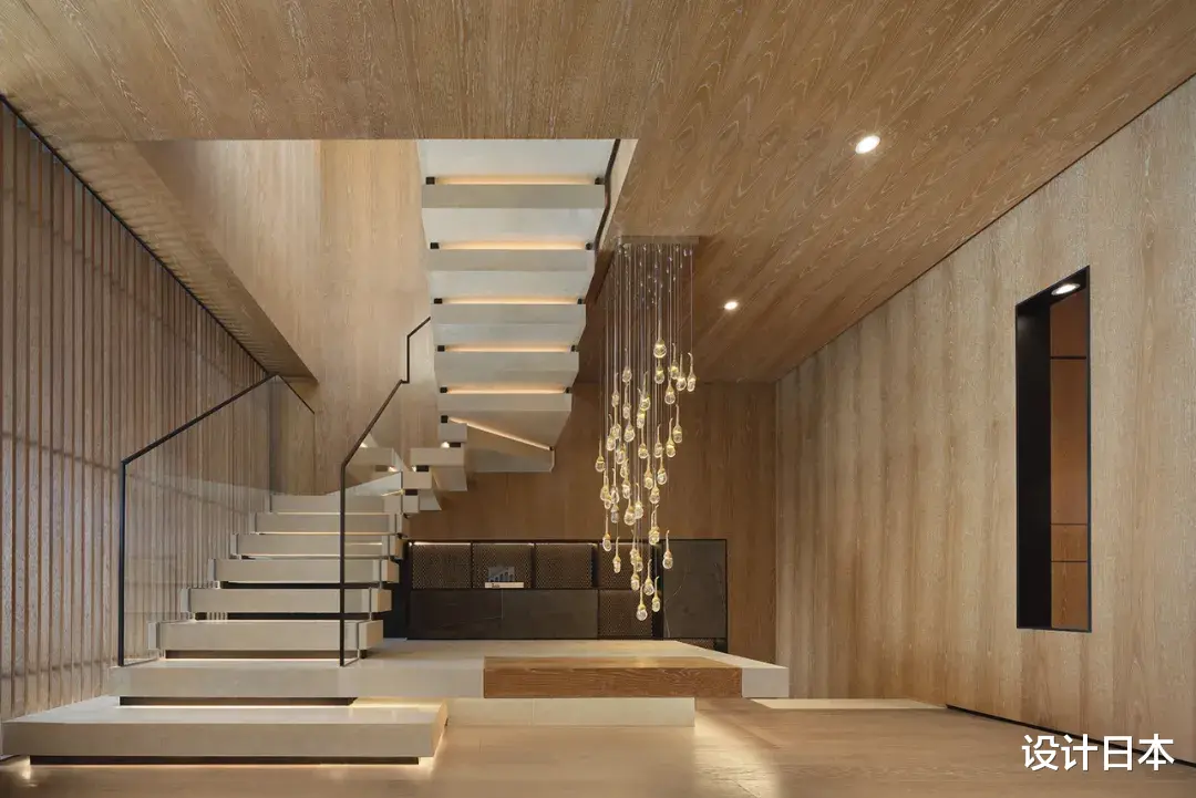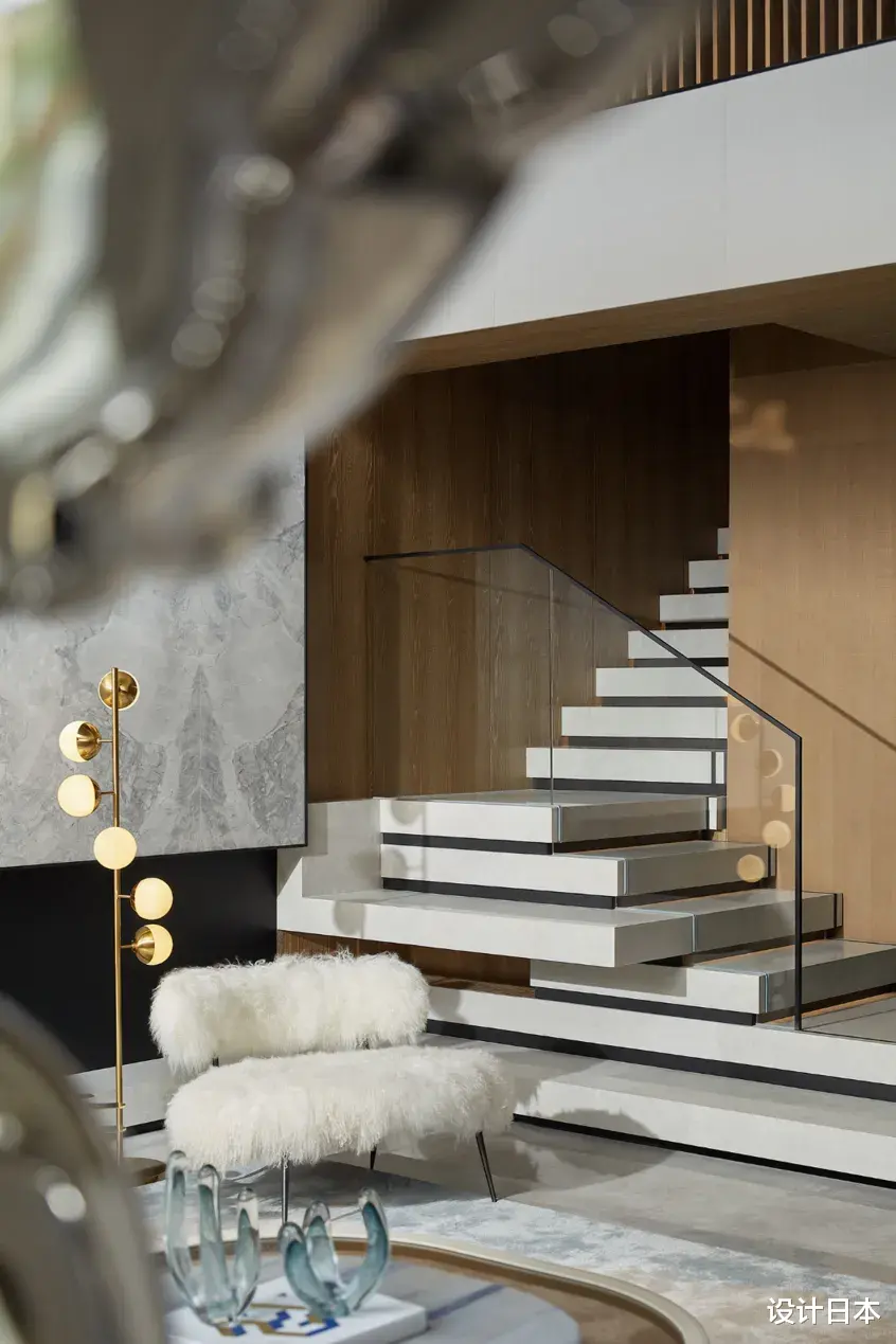 Stepping onto the staircase, the natural wonder hidden behind the living room is revealed before our eyes. The stone steps resonate harmoniously with the external scenery, like a joyful journey of climbing in the mountains. The cleverly hidden light strip on the steps brings peace to the soul and easily guides it to higher levels.