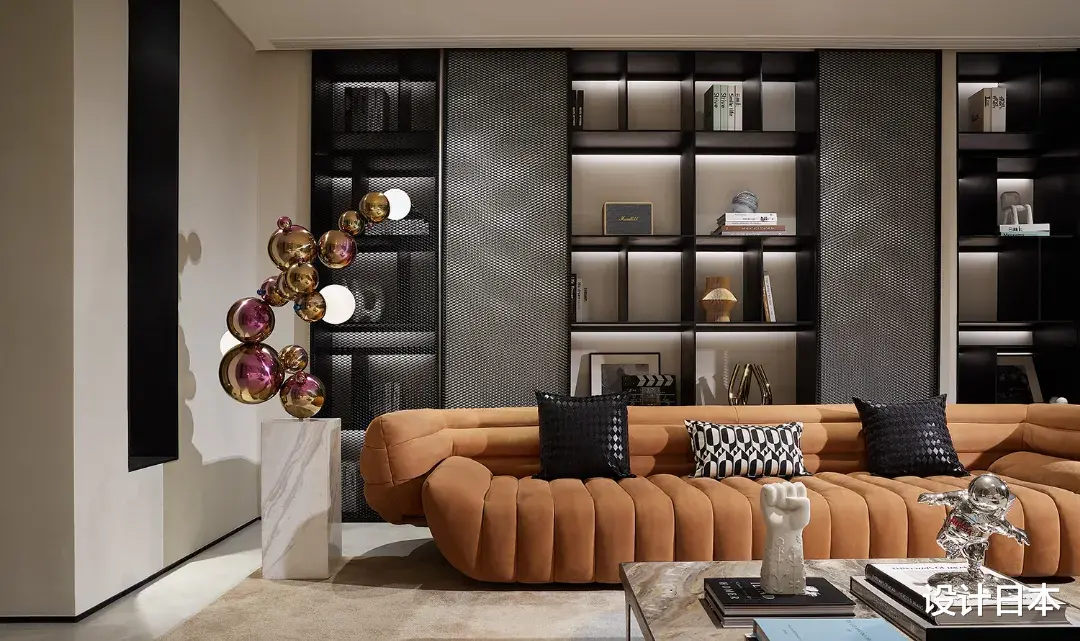 Entering the living room, you will be attracted by a huge sofa, which is the perfect place for family and friends to gather together. The cabinet behind is filled with various artworks, which not only add elegance to the space but also enhance the overall sense of luxury.