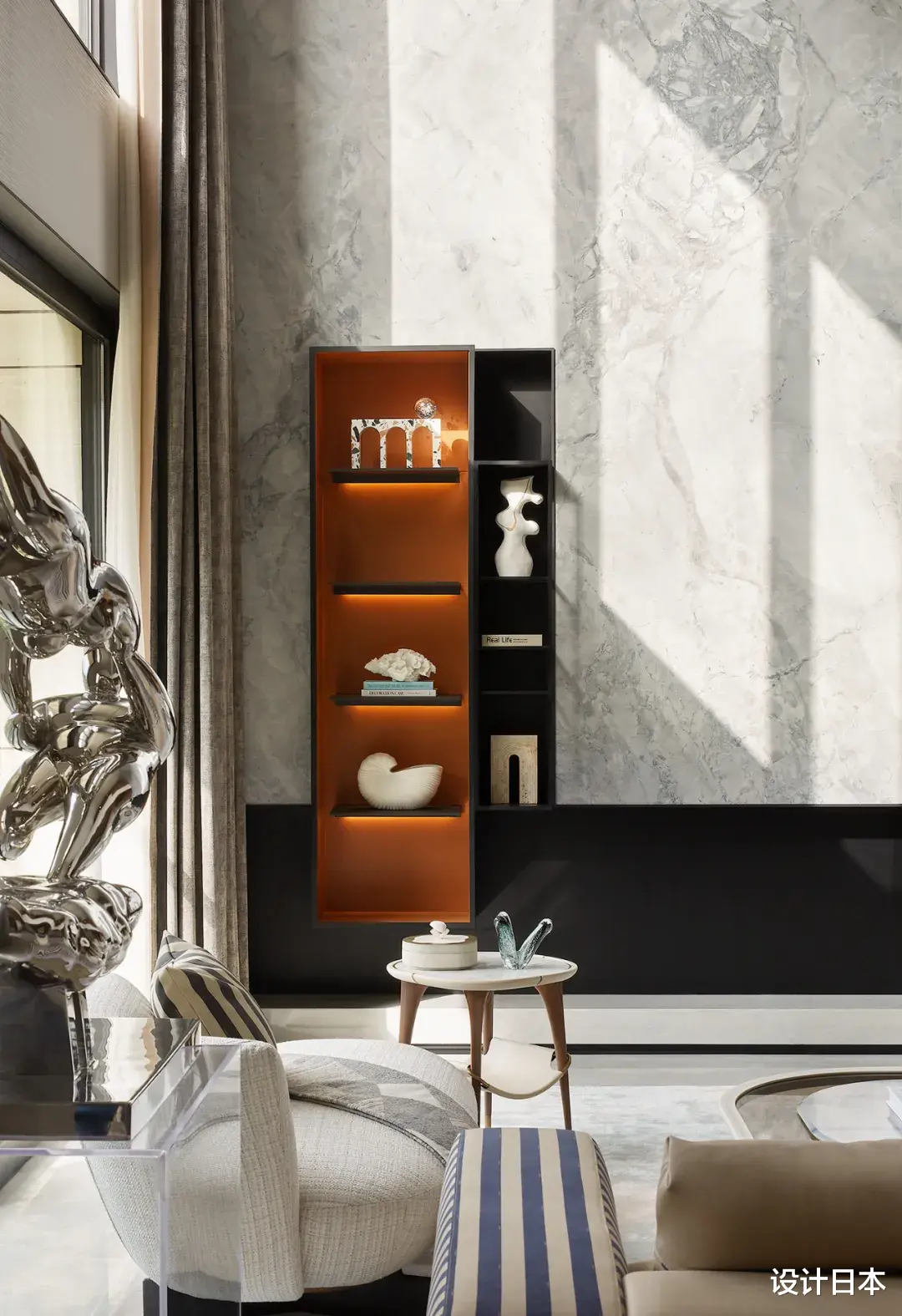 In a corner by the window, there is a carefully designed niche displaying various artworks, showcasing the owner's extraordinary aesthetic taste. The color of Hermes orange complements the soft lighting, emitting a luxurious atmosphere against the backdrop of the marble walls.