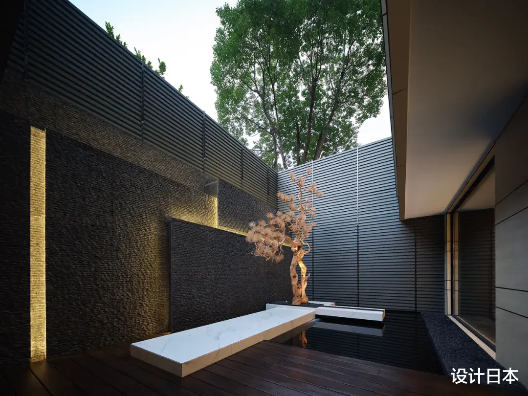 建筑师巧妙地采用下沉式庭院设计,为空间注入了浓郁的自然气息。庭院的布局尽显优雅与精致,水景与树木的和谐搭配,完美地描绘出自然的千姿百态。灯光映衬着绿植,展现出现代艺术的魅力。墙壁的层次与肌理,以及线条的装饰,共同勾勒出丰富的层次美感。在白色的休息区域,人们可以坐下来,仰望天空,尽情呼吸自然的气息。在这里,生活与静谧融为一体,愉悦感油然而生。