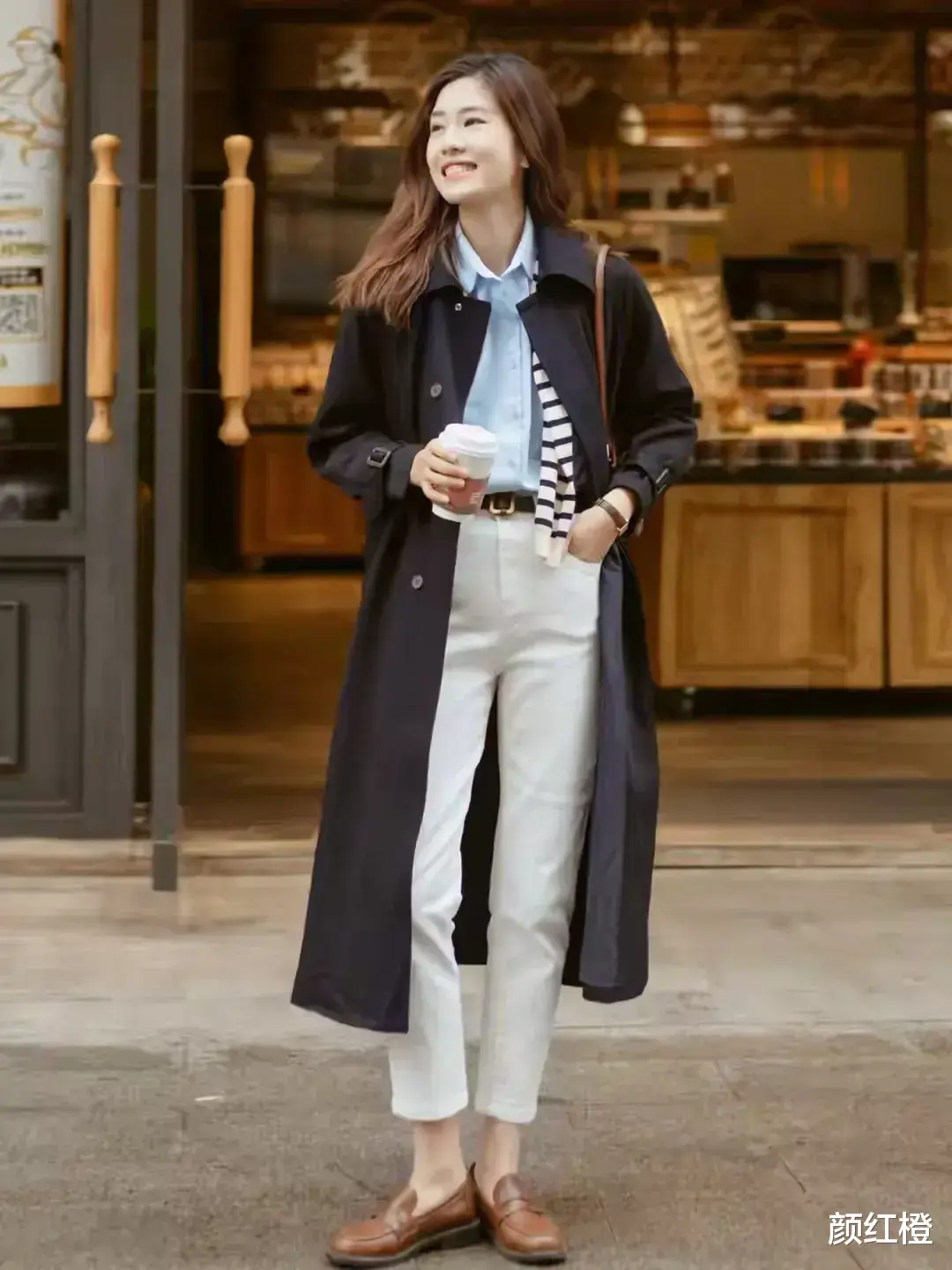 裤子的不同,穿出来的效果也是天壤之别,如果你想要走休闲风,直接选择天生就拥有休闲元素的牛仔裤,但是想要通勤时髦的职场风,就可以选择西装裤来搭配风衣最佳,例如下面这位博主选择一款风衣内搭衬衫,加上杏色的西裤和白色的乐福鞋,呈现出来的效果就比较干练。