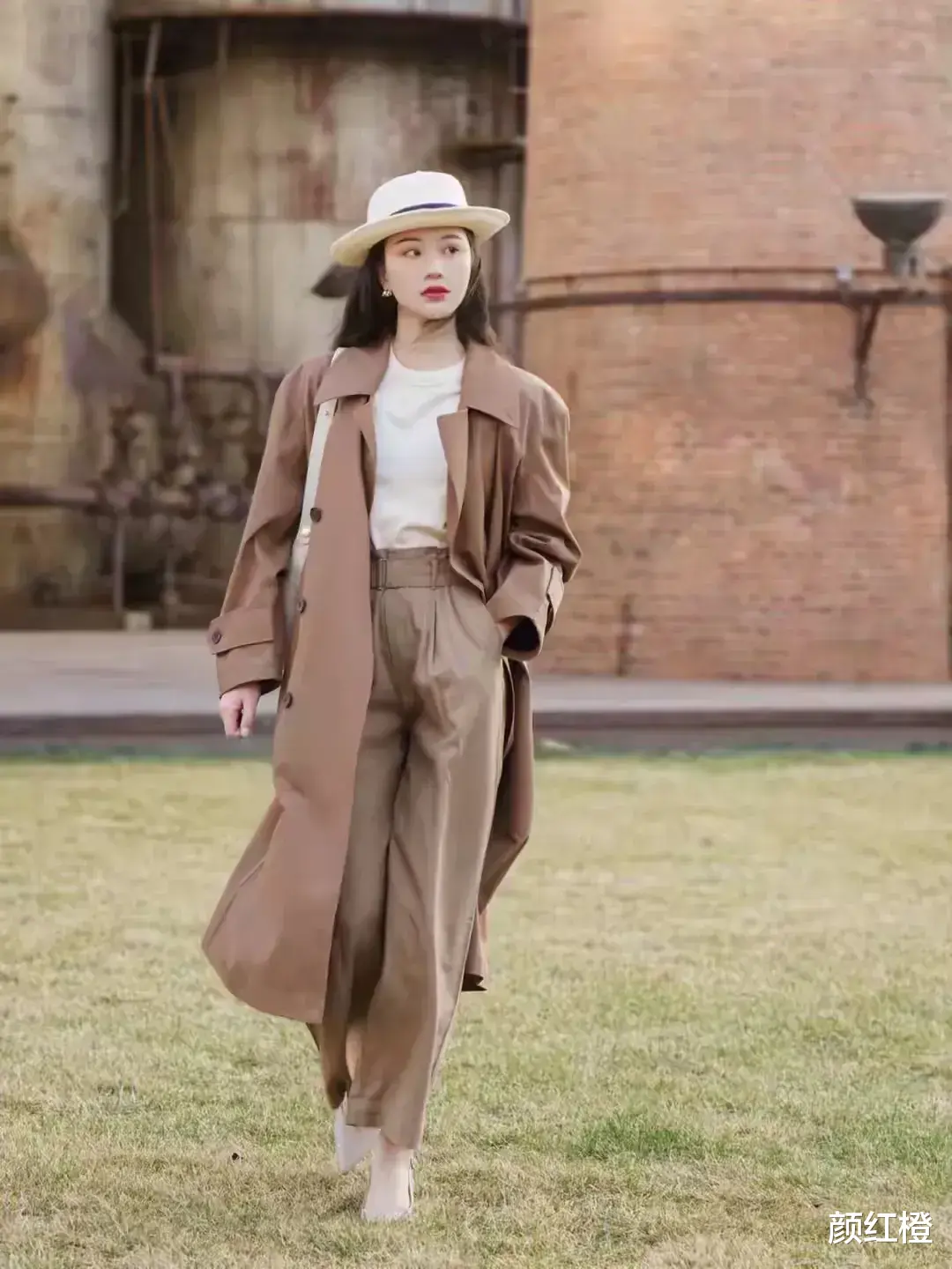 也可以加上一款好看的草帽,能增加整个造型的氛围感,例如下面这位博主用白色的草帽,加上棕色的风衣和同色系的西装裤,呈现出来的视觉效果就很有女神范。